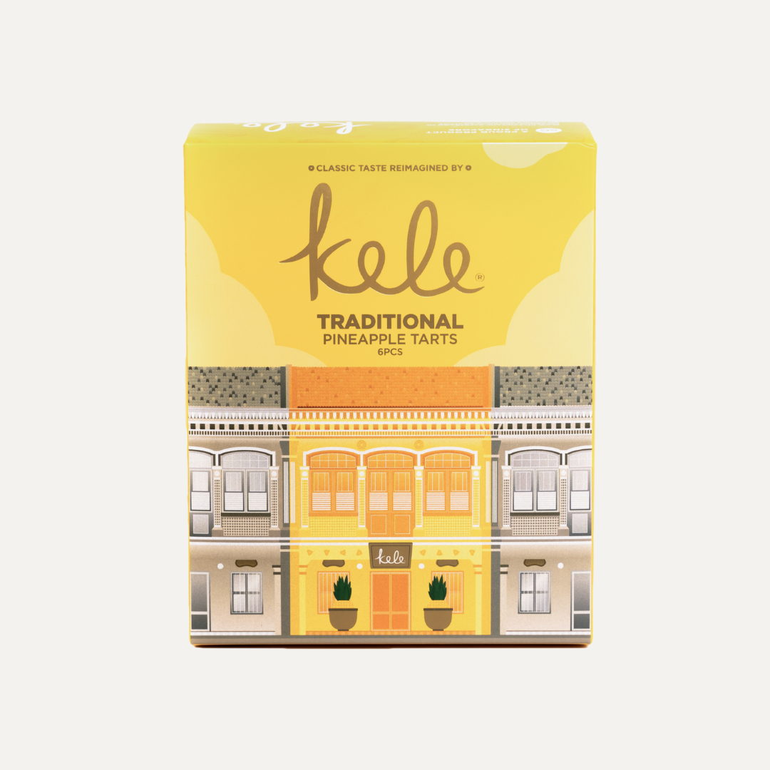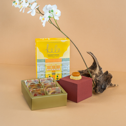 The 6-piece Peranakan Souvenir Box contains six (6) individually-wrapped pieces in a colourful box featuring whimsical artwork of a Peranakan shopfront. Each piece comes in its own individual golden tray, wrapped securely in gold-stamped translucent film.