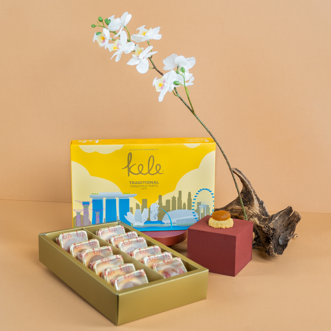 The 12-piece Skyline Souvenir Box contains twelve (12) individually-wrapped pieces in a colourful box emblazoned with artwork of the iconic Singapore skyline. Each piece comes in its own individual golden tray, wrapped securely in gold-stamped translucent film.