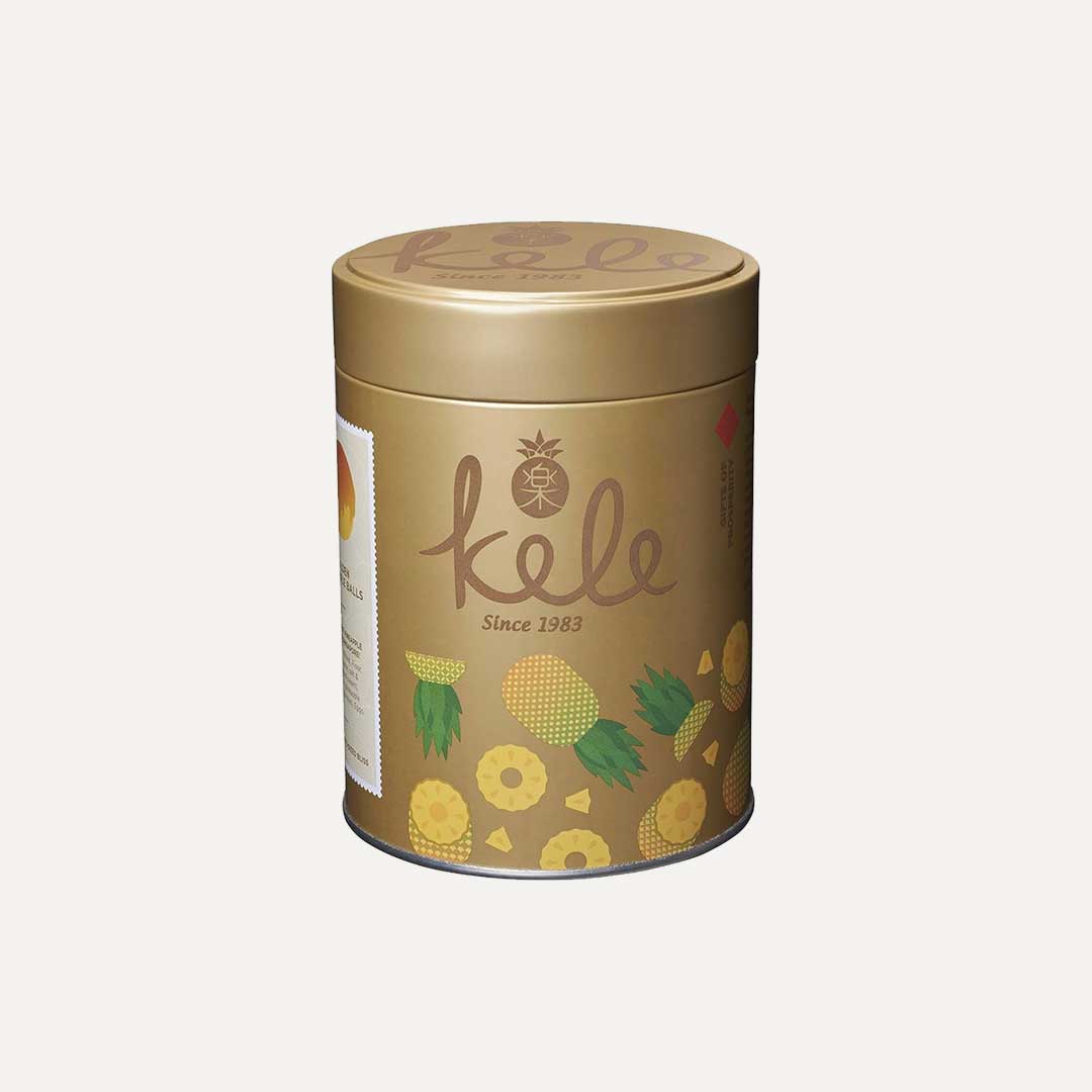Our elegant tin packaging is a perfect blend of style and practicality. Weighing approximately 700 grams and holding around 27-30 pieces, each tin is designed to be both lightweight and sturdy. The striking golden exterior, adorned with the Kele logo and iconic pineapple motifs, ensures that your pineapple tarts arrive in style and are stored with care.